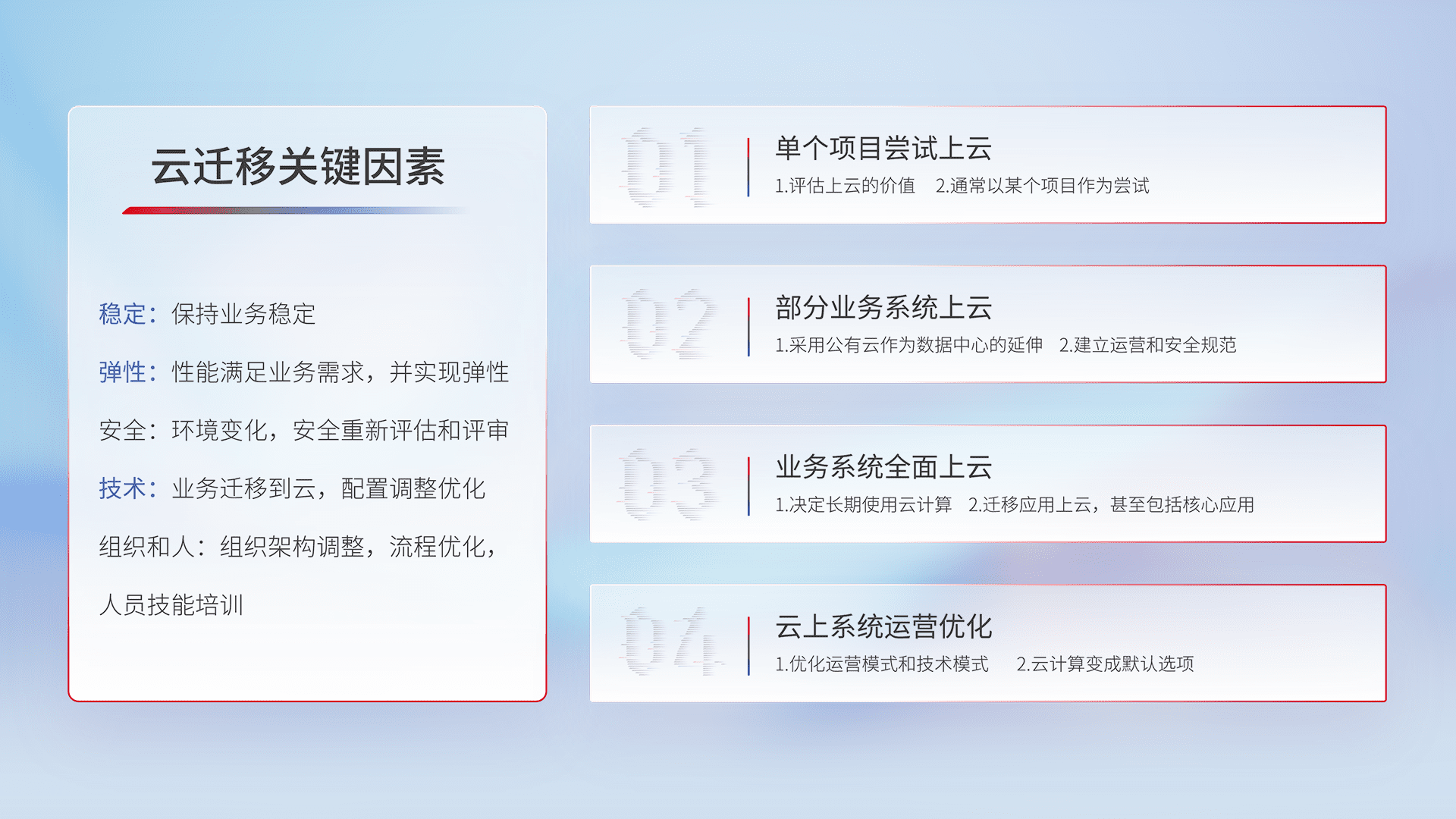 结合实际业务,,,从规划设计、、、、云平台选型、、、云原生改造、、、、数据迁移、、集成交付,,,,迁移全过程为客户识别最佳上云路径,,做好风险识别管理,,,,设计网络架构、、、身份权限、、、、安全审计合规、、、、操作审计、、、日志审计、、监控告警策略、、、多站点容灾设计等,,,对云上基础设施进行整体规划,,,,提升IT治理水平,,,,以满足弹性、、高可用、、、高性能的需求。。