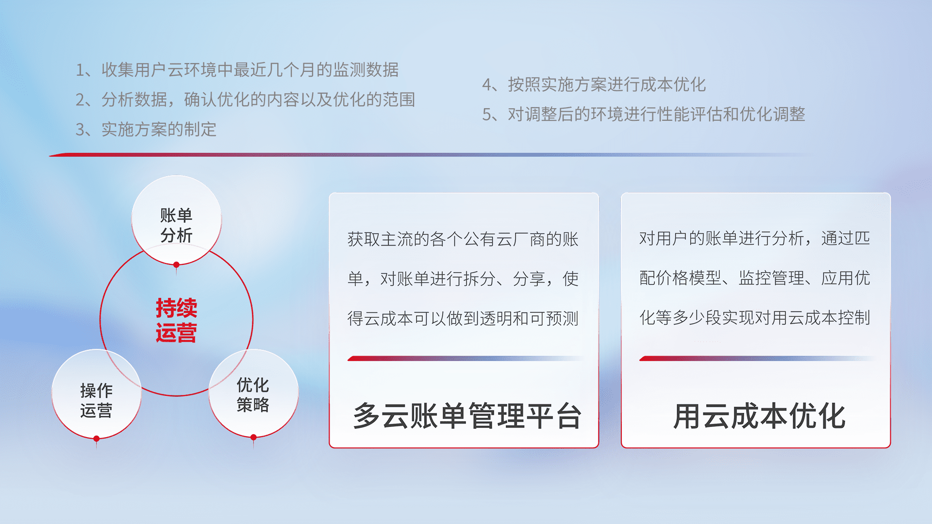 通过多云纳管,,,以统一的资源数据模型把客户的云资源进行抽象和封装,,,进而实现对多云资源的统一操作,,,保障云资源管理的可靠性、、、、稳定性与可用性。。。。量身定制化运维内容,,,配置、、、开发运维、、补丁管理、、、、备份、、、、监控、、认证和访问管理、、、审计和日常巡检等,,,保障在用云过程中的可靠度,,,,稳定度以及高可用率。。。。